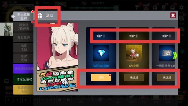 2、关注【活动】界面,如【新人支援签到】,按天数完成任务领取对应奖励,像钻石、角色等。