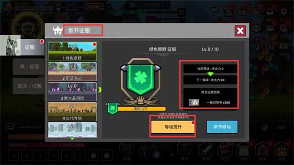 3、推进【章节征服】,完成关卡任务提升等级,领取属性加成等奖励,增强角色实力。