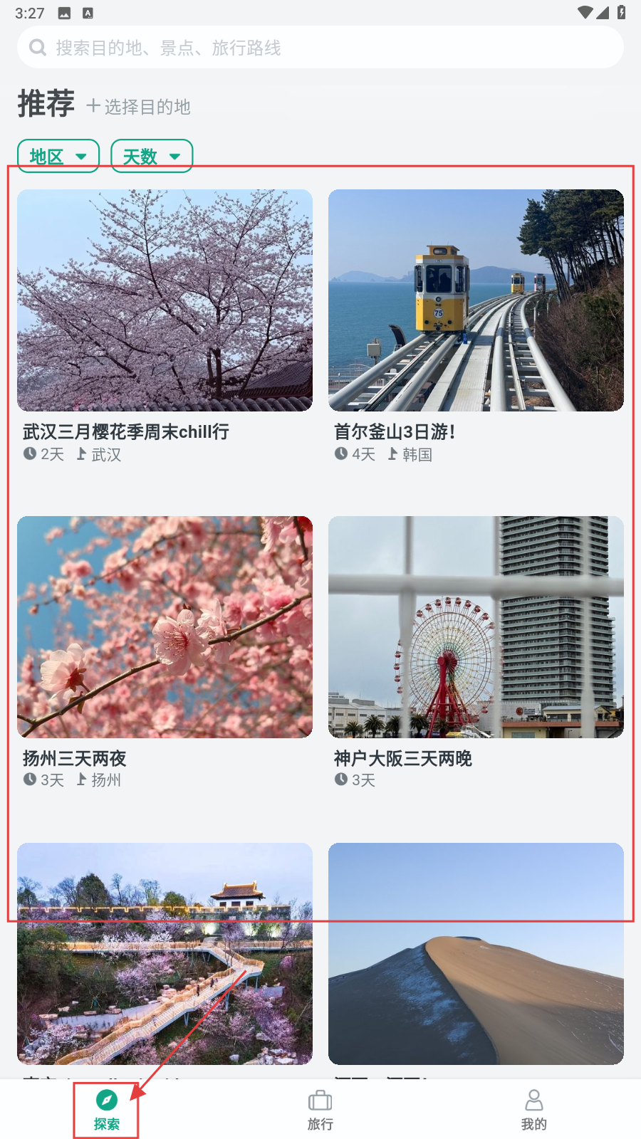 1、打开应用,在探索页面可以选择想去的地点并点击。