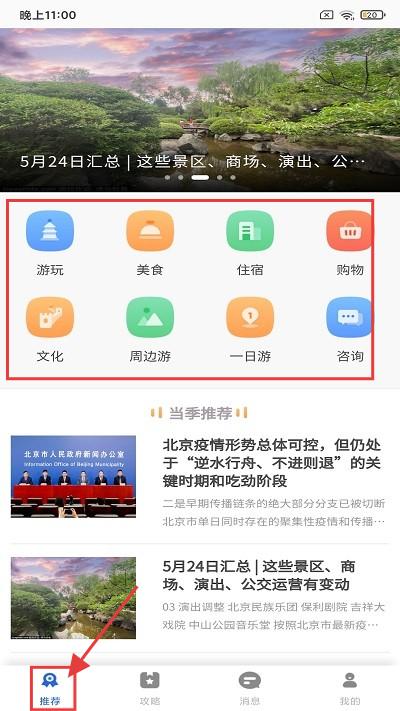 1、打开应用,在推荐页面中可以查看游玩、住宿、美食等服务。