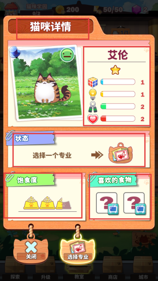 1、在【猫咪详情】界面,查看猫咪【艾伦】各项属性,根据其优势属性为它【选择一个专业】,并关注饱食度,及时补充食物维持状态。