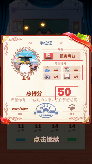 2、猫咪学习结束后,查看学位证上的专业和考试得分,了解猫咪学习成果,总得分可作为评估其表现的重要依据。