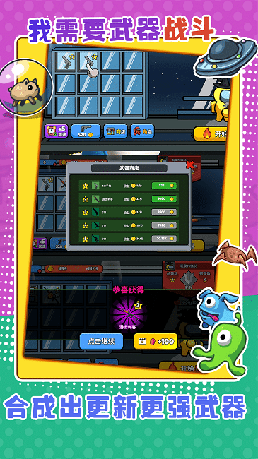 2、战斗胜利后,会获得新武器和金币奖励,点击“点击继续”按钮以继续游戏进程。