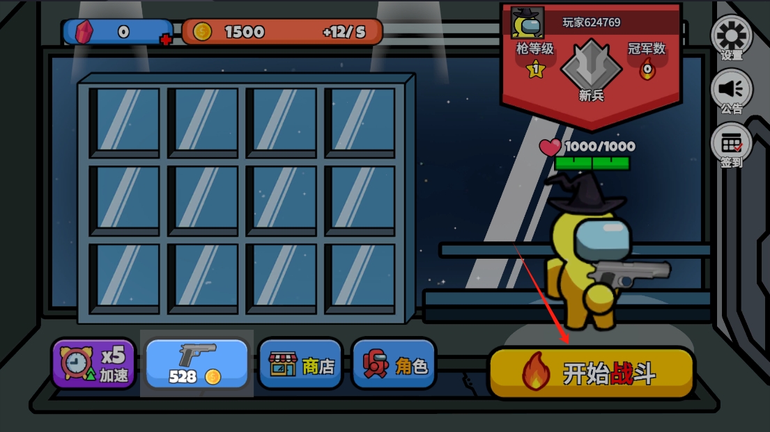 1、进入游戏后,点击“开始战斗”按钮进入战斗场景,准备迎接挑战。游戏界面会显示角色的生命值和金币数量。