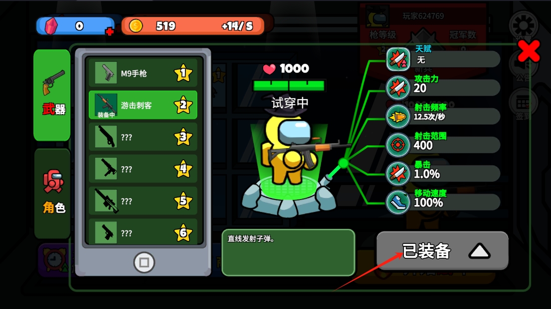 3、在装备界面,选择适合的武器进行装备,查看武器属性,如攻击力、射击频率等,以优化战斗策略。
