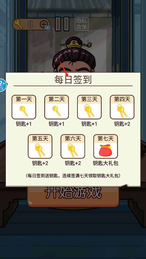 2、点击“开始游戏”按钮,进入游戏主界面,准备开始游戏挑战。游戏界面会显示当前拥有的钥匙数量。