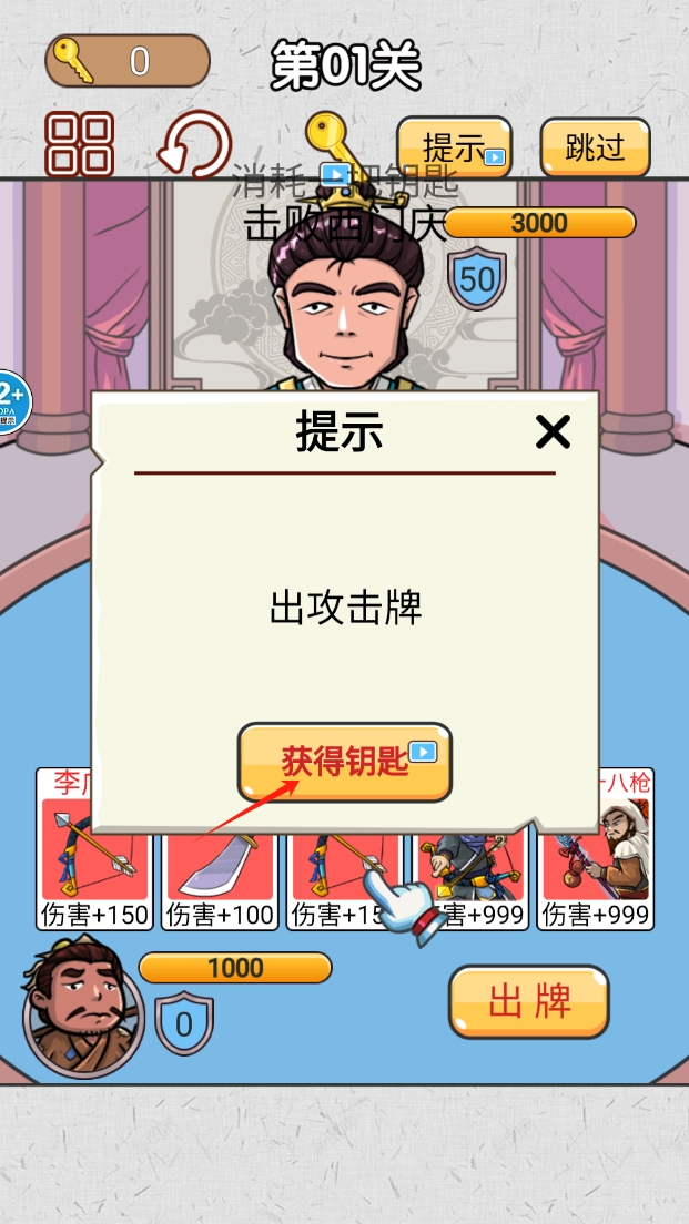 3、在游戏关卡中,根据提示出牌,击败对手以获得胜利。胜利后可获得钥匙奖励,提升游戏进度。
