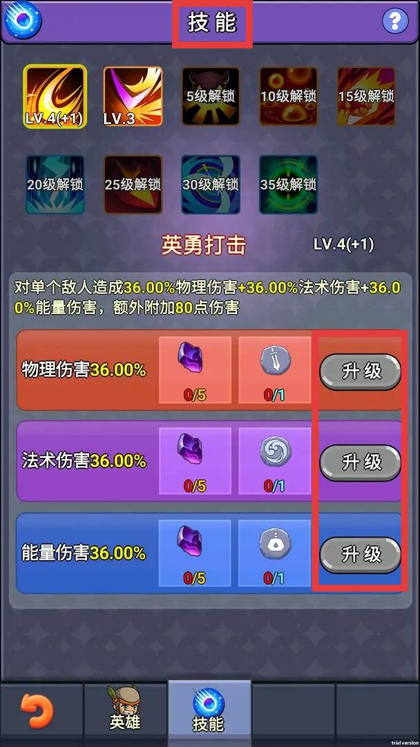 3、在【技能】界面,随着角色等级提升解锁新技能。对于已解锁技能,收集对应材料,点击【升级】按钮提升技能伤害,增强角色战斗能力。