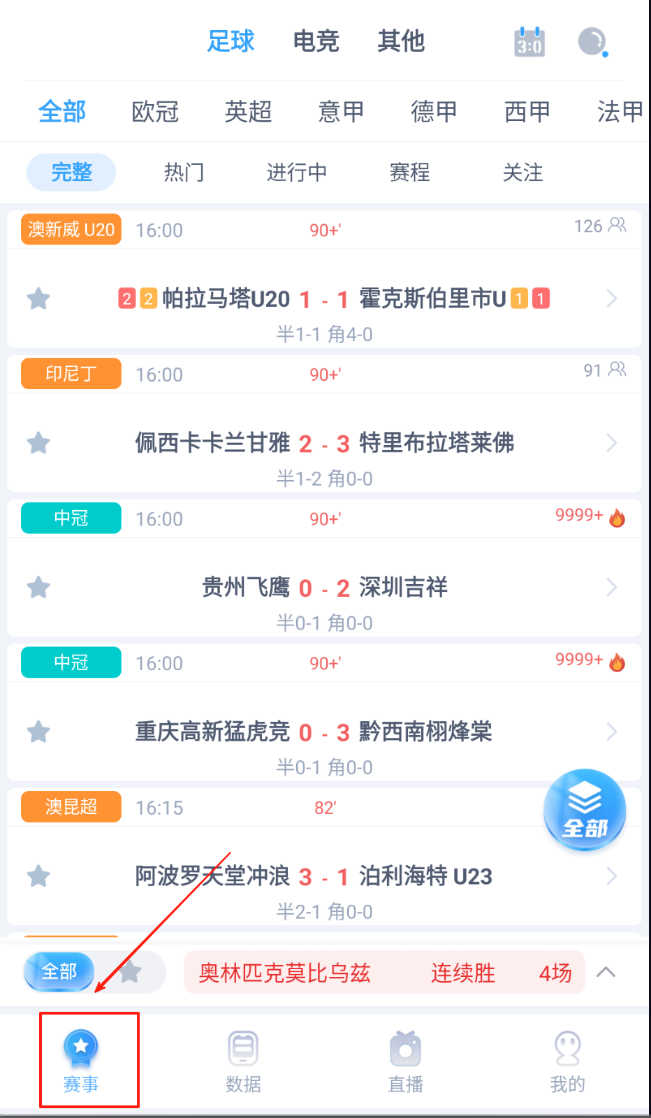 1、进入首页即可查看完整赛事日程表,通过联赛分类或日期筛选功能快速定位目标球队的近期比赛安排。