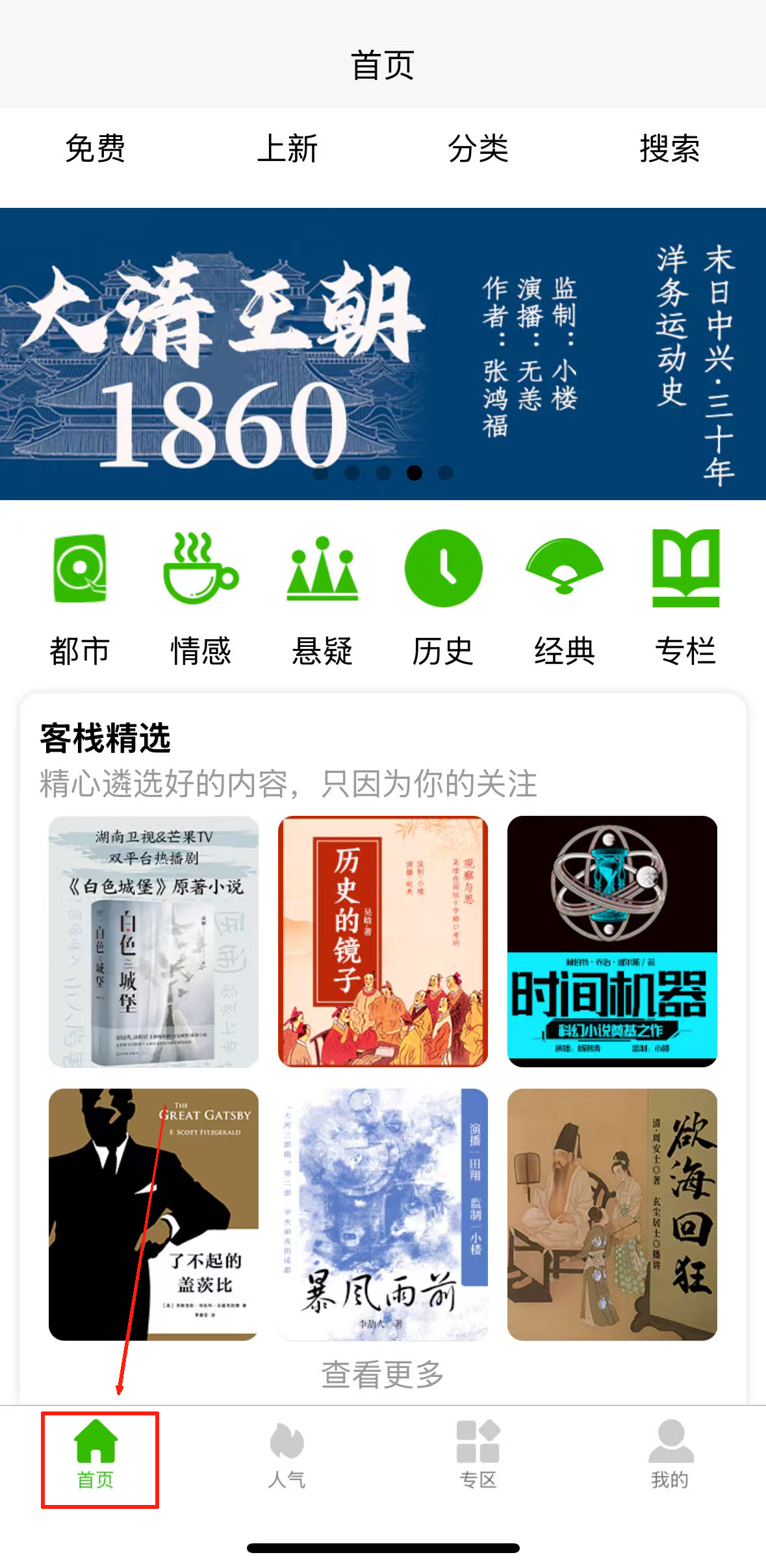 1、安装完成后进入首页浏览推荐专题,通过分类标签筛选悬疑或历史类目查找目标内容。