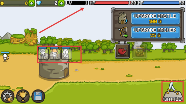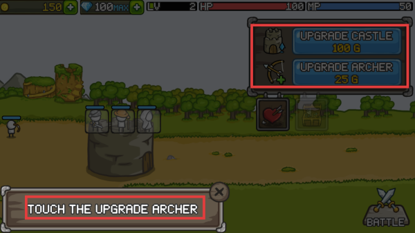 2、按照提示【TOUCHTHEUPGRADEARCHER】,点击【UPGRADEARCHER】选项升级弓箭手,提升防御能力;也可按需花费100G升级城堡。