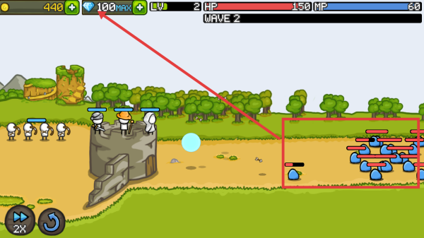 3、注意屏幕上方钻石数量,积累资源;面对如屏幕右侧红框内的怪物波次(【WAVE2】),指挥防御单位进行攻击,利用资源优势强化防御。