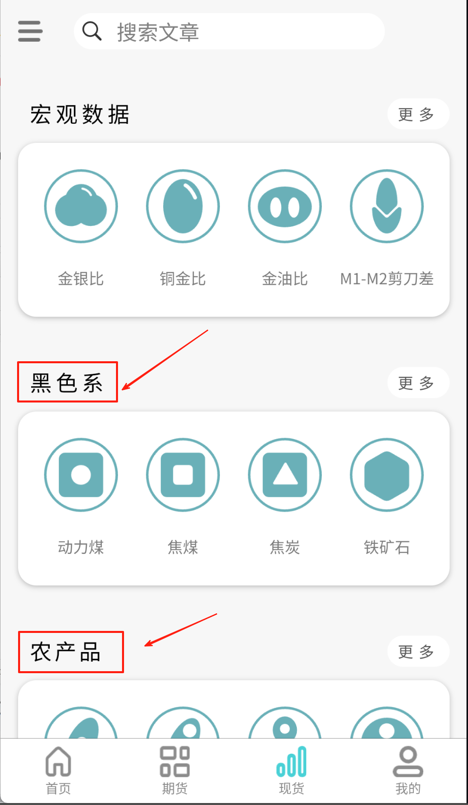 2、要查大宗商品信息就去"黑色系"或"农产品"分类,点右上角"更多"按钮能看到焦煤、铁矿石等详细行情。