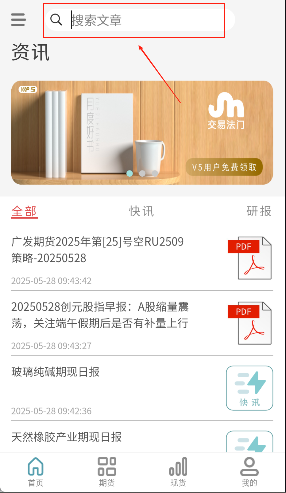 3、搜索文章超简单,首页顶栏输入关键词就行,带PDF标识的研报点进去还能直接看文件呢。