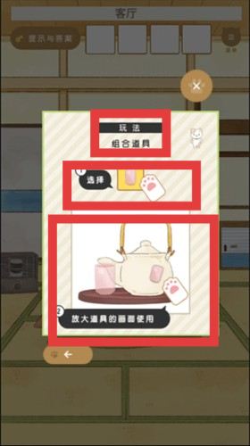 2、熟悉【组合道具】玩法,【选择】相应道具,按照提示在放大道具画面后进行操作组合道具。