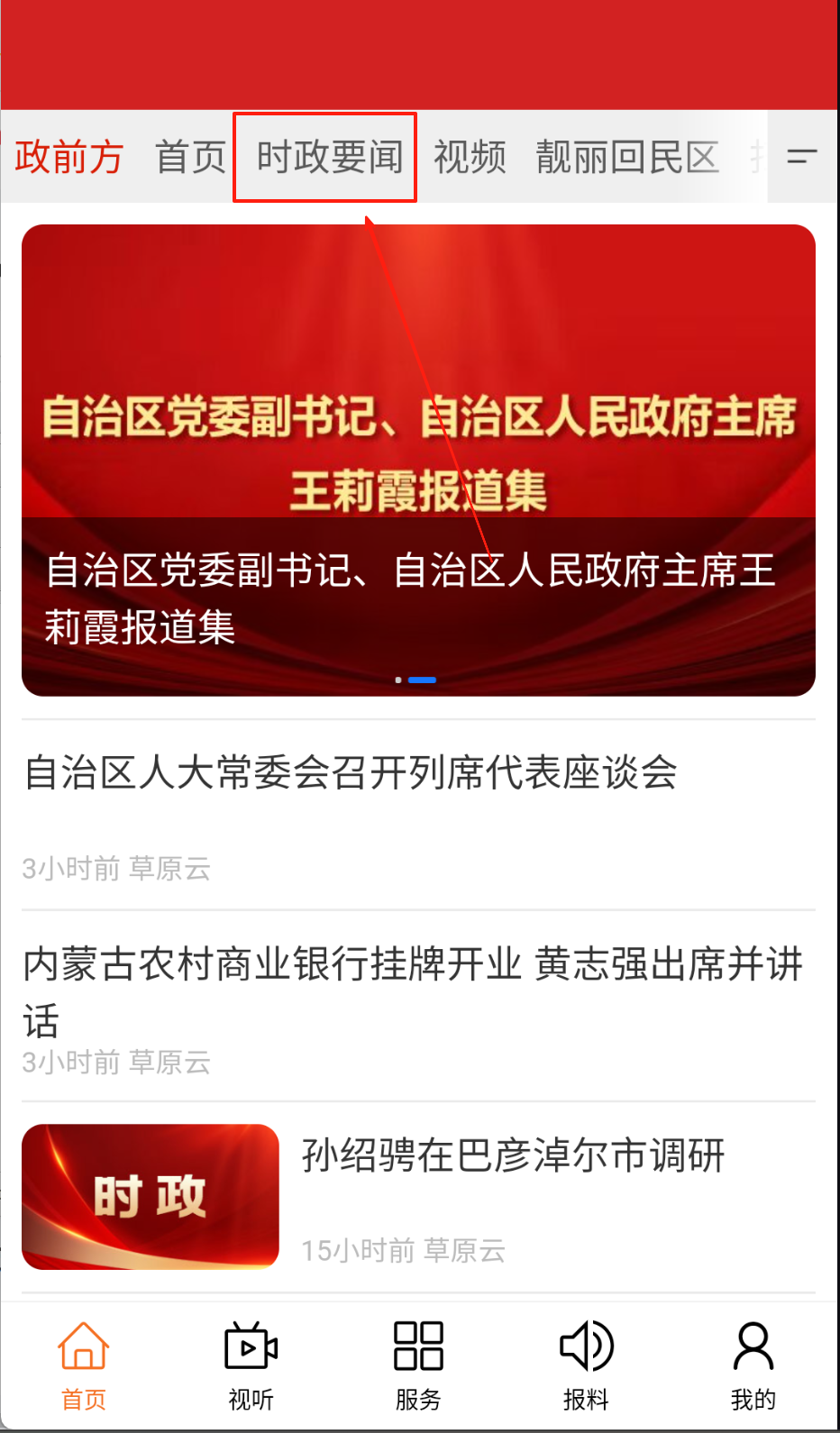 2、点击首页顶部导航栏的"时政要闻"或滑动至"直播"频道,即刻查看辖区最新政策与突发事件。