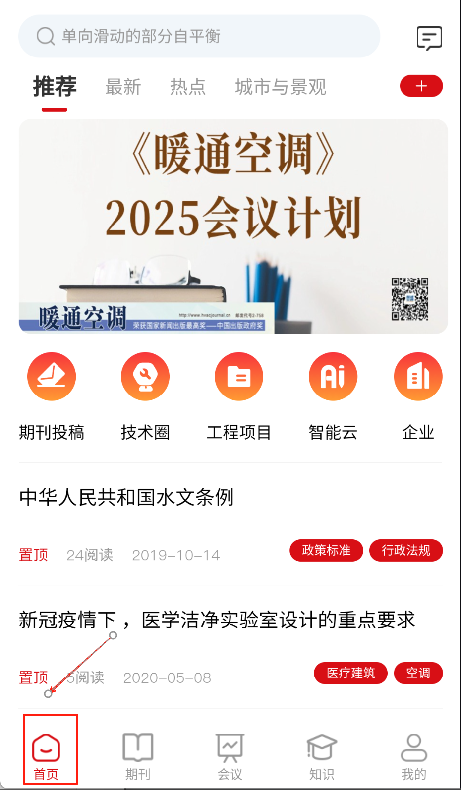 1、启动应用首页自动推送热门期刊与会议动态,点击专业标签可筛选建筑规划等细分领域内容。