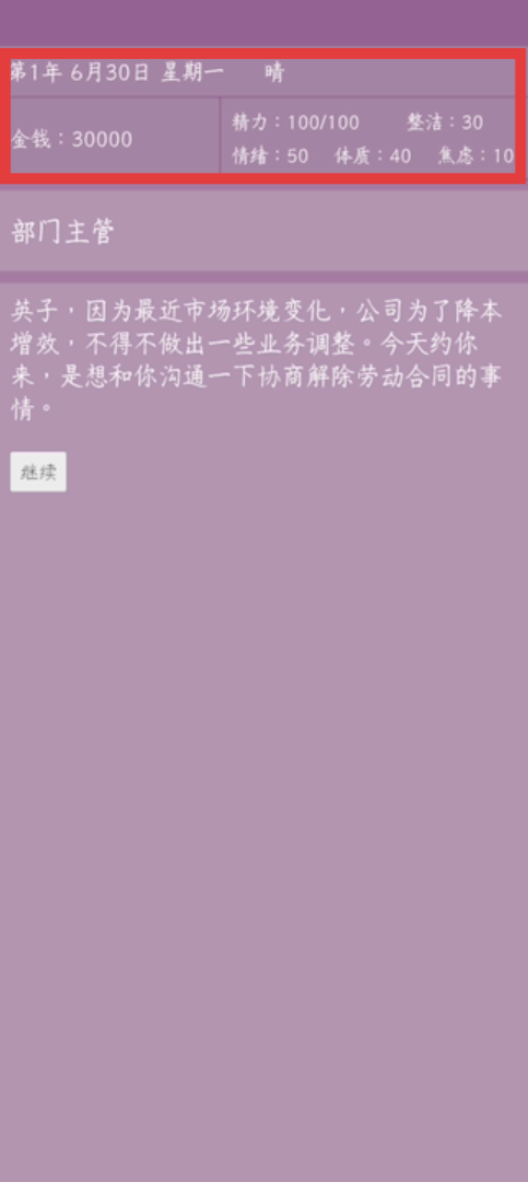 1、关注游戏界面上方显示的日期(如【第1年6月30日】)、天气、以及各类状态数值(【金钱】【精力】等),了解自身当前状况。
