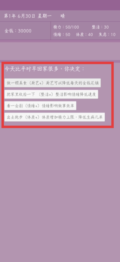 2、当面临【今天比平时早回家很多,你决定】的选择时,根据自身需求选择相应行动。