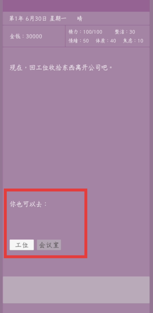 3、在收到【现在,回工位收拾东西离开公司吧。】的指令后,若有额外地点选择,可根据剧情走向或个人规划进行选择,探索不同剧情分支。