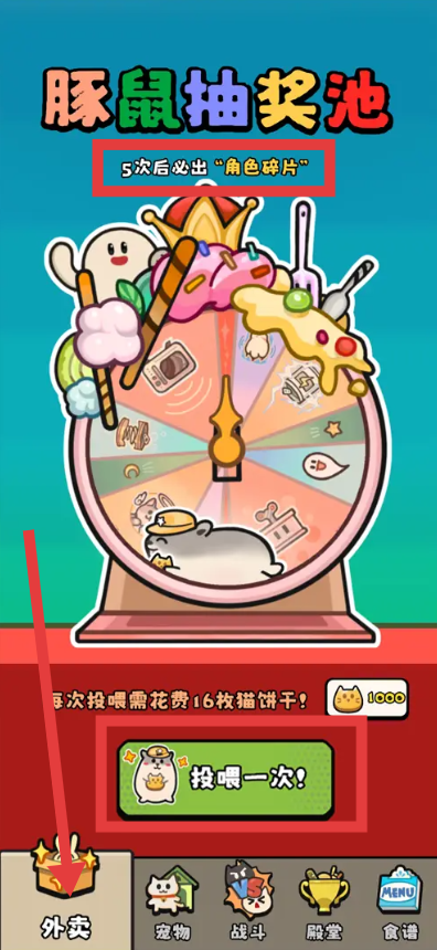 1、在【豚鼠抽奖池】中,每次投喂花费16枚猫饼干,且5次后必出【角色碎片】,可通过抽奖积累角色碎片等资源。
