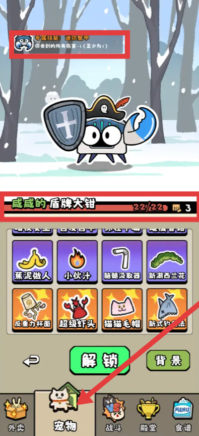 2、进入【宠物】界面,关注宠物的专属技能,如【迷你铠甲:你受到的所有伤害-1(至少为1)】,合理利用宠物技能助力战斗。