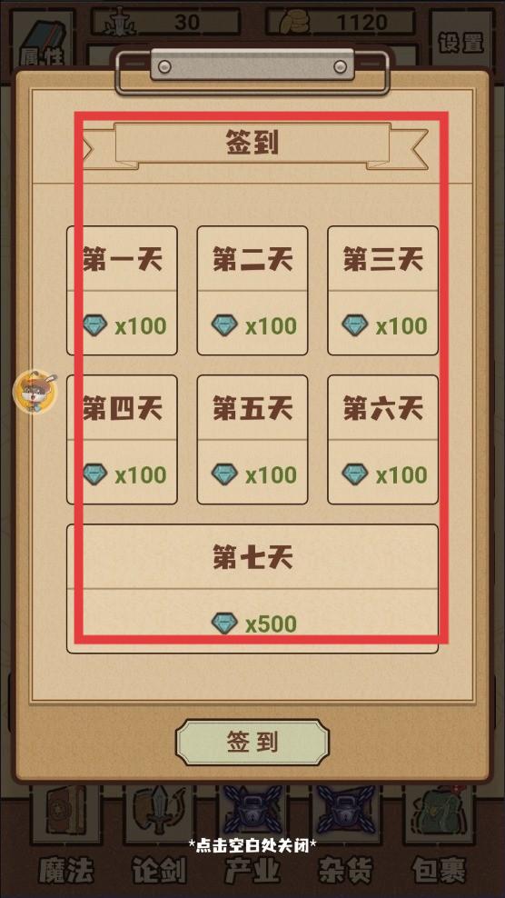 1、每日登录游戏后,点击【签到】界面中的对应天数格子领取奖励,前六天每天可领100钻石,第七天可领500钻石,积累游戏资源。