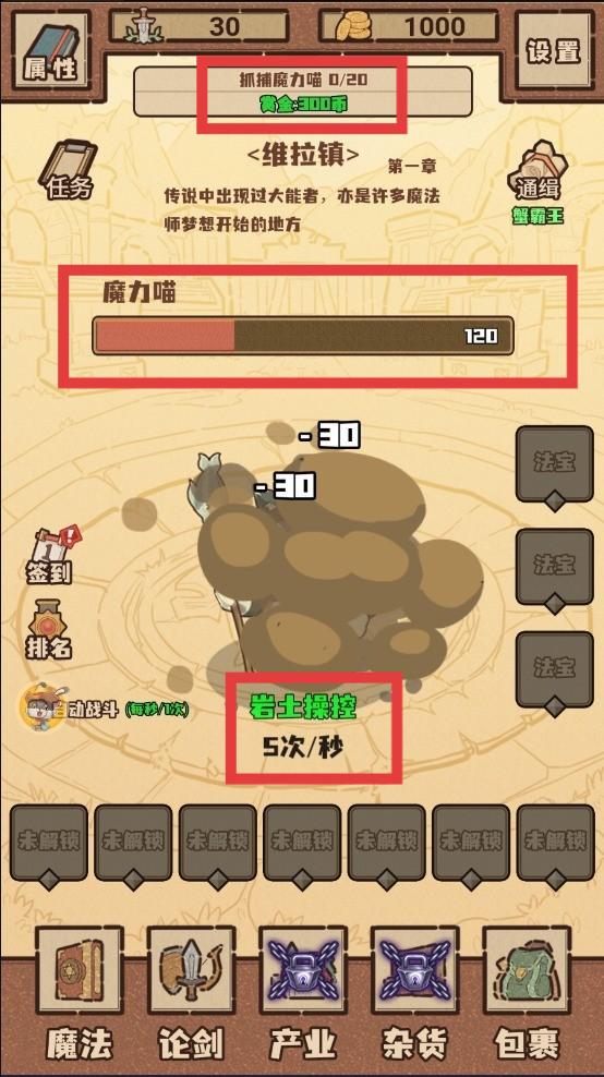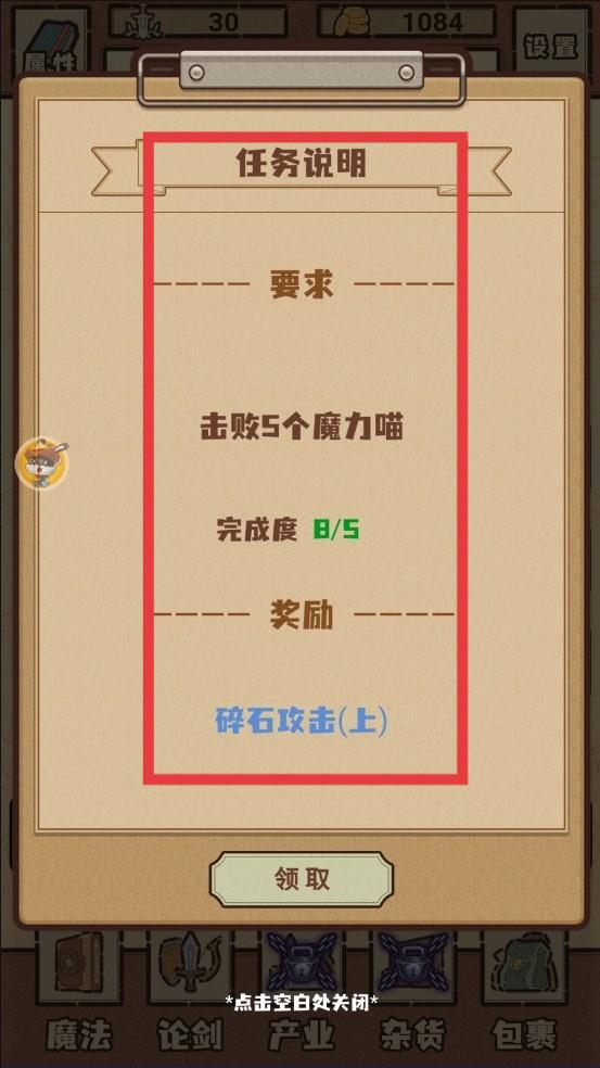 2、关注【任务】板块,像【击败5个魔力喵】这类任务,完成后及时点击【领取】获取奖励(如【碎石攻击(上)】),推动角色能力提升。