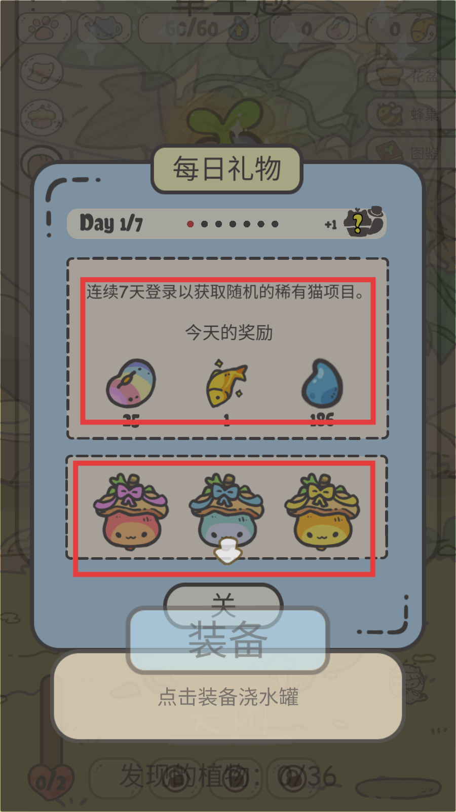 1、每日登录游戏,点击【每日礼物】领取当天奖励(如彩色蛋、小鱼、水滴等),连续7天登录可获取随机稀有猫项目,积累游戏资源。