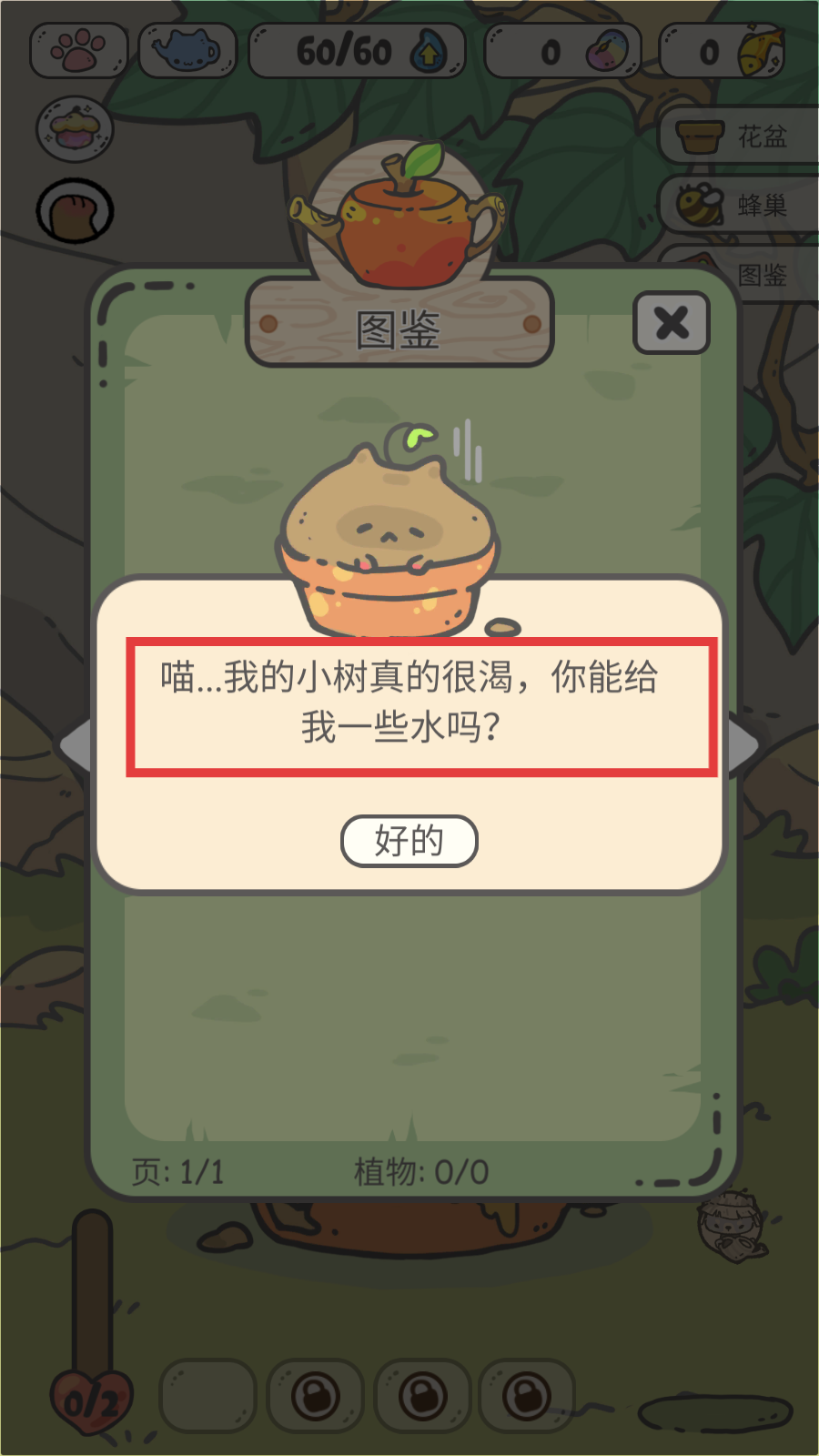 3、当图鉴中角色提示(如【喵我的小树真的很渴,你能给我一些水吗?】)需要水时,结合获取的水滴资源,满足其需求推进游戏进程。