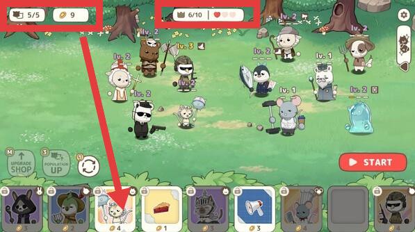 2、留意界面上方资源数值(如【金币数量】【某种资源数量6/10】),积累资源用于购买和升级角色,提升队伍整体实力。
