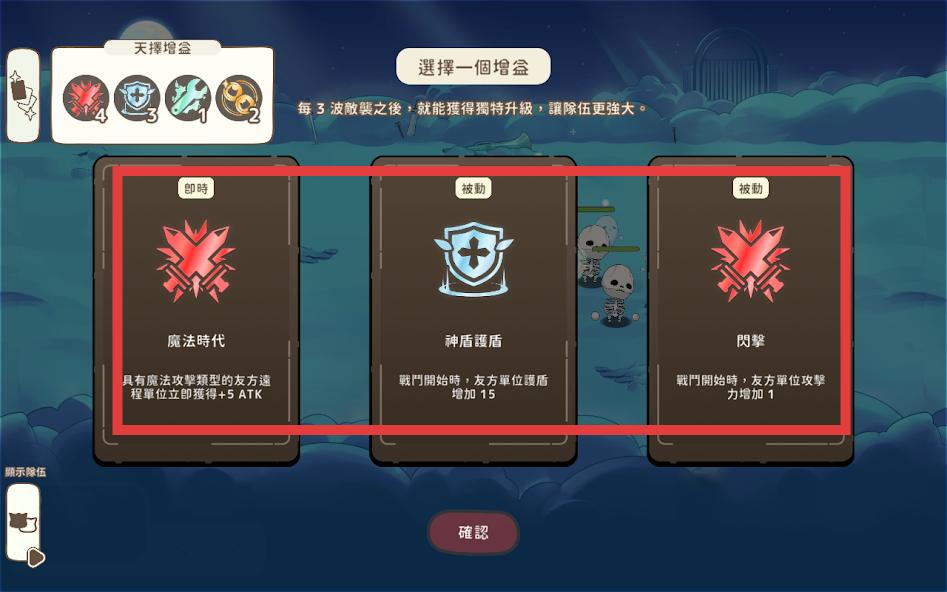 3、每3波敌袭后出现【天择增益】选择界面,根据队伍构成和战斗需求,从三个增益中选择,强化队伍战斗力。