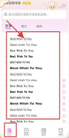 1、打开应用,在输入框输入纯英文或数字,在【文字】分类下,可选择如“BestWishToYou”等不同字体样式。