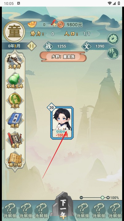 3、进入游戏主界面后,关注【势力】【人口】等数值,通过点击【下一年】推进游戏进程,留意左侧功能选项,探索游戏内容。