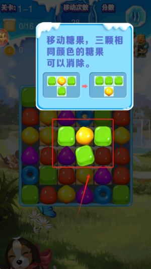 3、进行消除:在游戏界面中,通过移动糖果使三颗或以上相同颜色的糖果连成一线进行消除,完成关卡目标。
