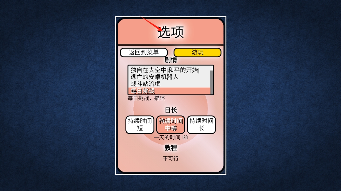 3、选项界面展示,在选项界面,选择剧情模式或每日挑战。根据个人喜好调整游戏时长和教程设置,确保游戏体验符合个人需求。