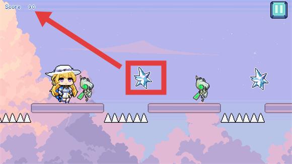 3、利用角色跳跃,按照红色箭头指示方向获取红框内的星星道具来增加分数。