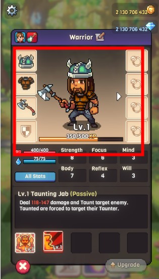 2、对于【Warrior】职业角色,可关注其等级(Lv.1)、属性,利用其【Lv.1TauntingJab】被动技能,造成伤害并嘲讽敌人吸引仇恨。