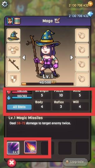 3、针对【Mage】职业角色,留意其等级(Lv.1)、属性数值,使用【Lv.1MagicMissiles】技能,对目标敌人造成两次58-72点伤害。