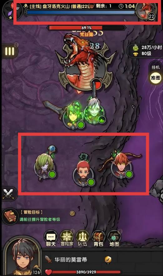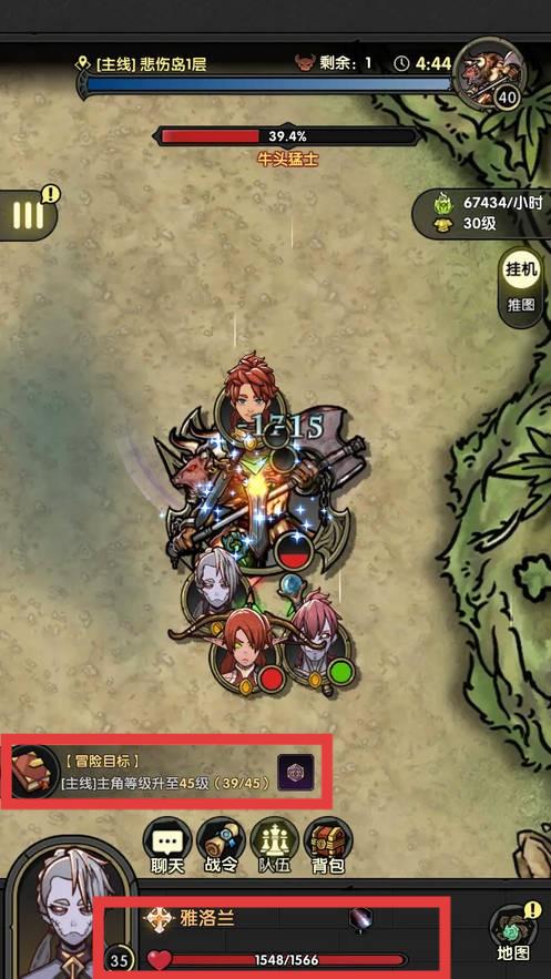 1、关注屏幕上方的关卡信息和剩余时间,按照【冒险目标】提示,努力将主角等级升至45级,推进主线任务。