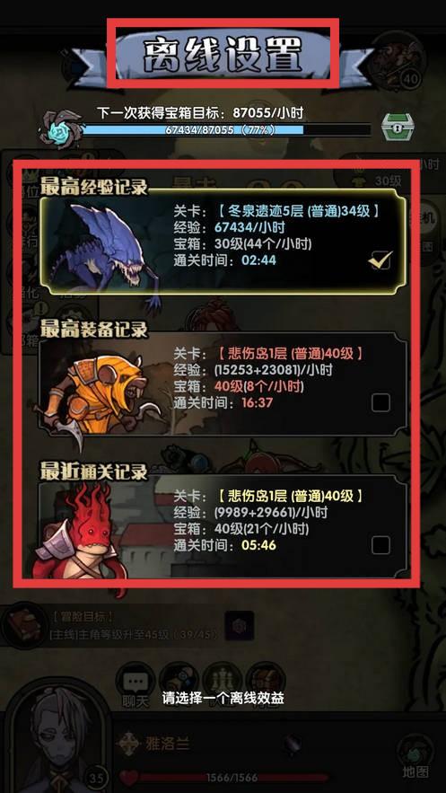 3、在【离线设置】界面,参考【最高经验记录】【最高装备记录】等信息,选择收益较高的关卡进行离线挂机,获取经验和宝箱奖励。