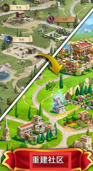 2、利用消消乐关卡奖励,逐步解锁并重建【农场】【作坊】等社区建筑,完成社区重建目标。
