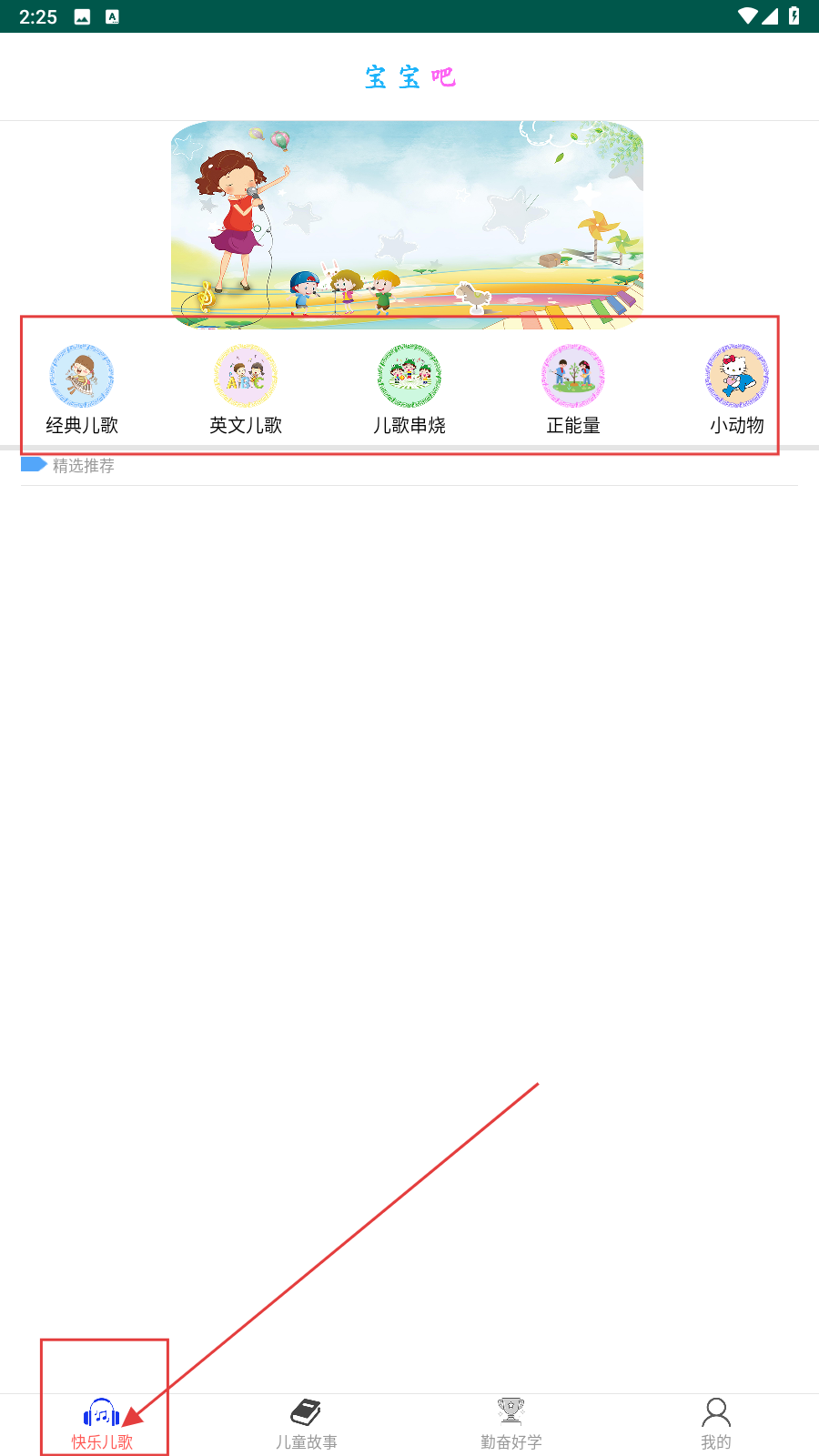 1、打开应用,点击底部【快乐儿歌】按钮。在该界面,可选择【经典儿歌】【英文儿歌】等分类,播放相应儿歌,给孩子进行音乐启蒙。