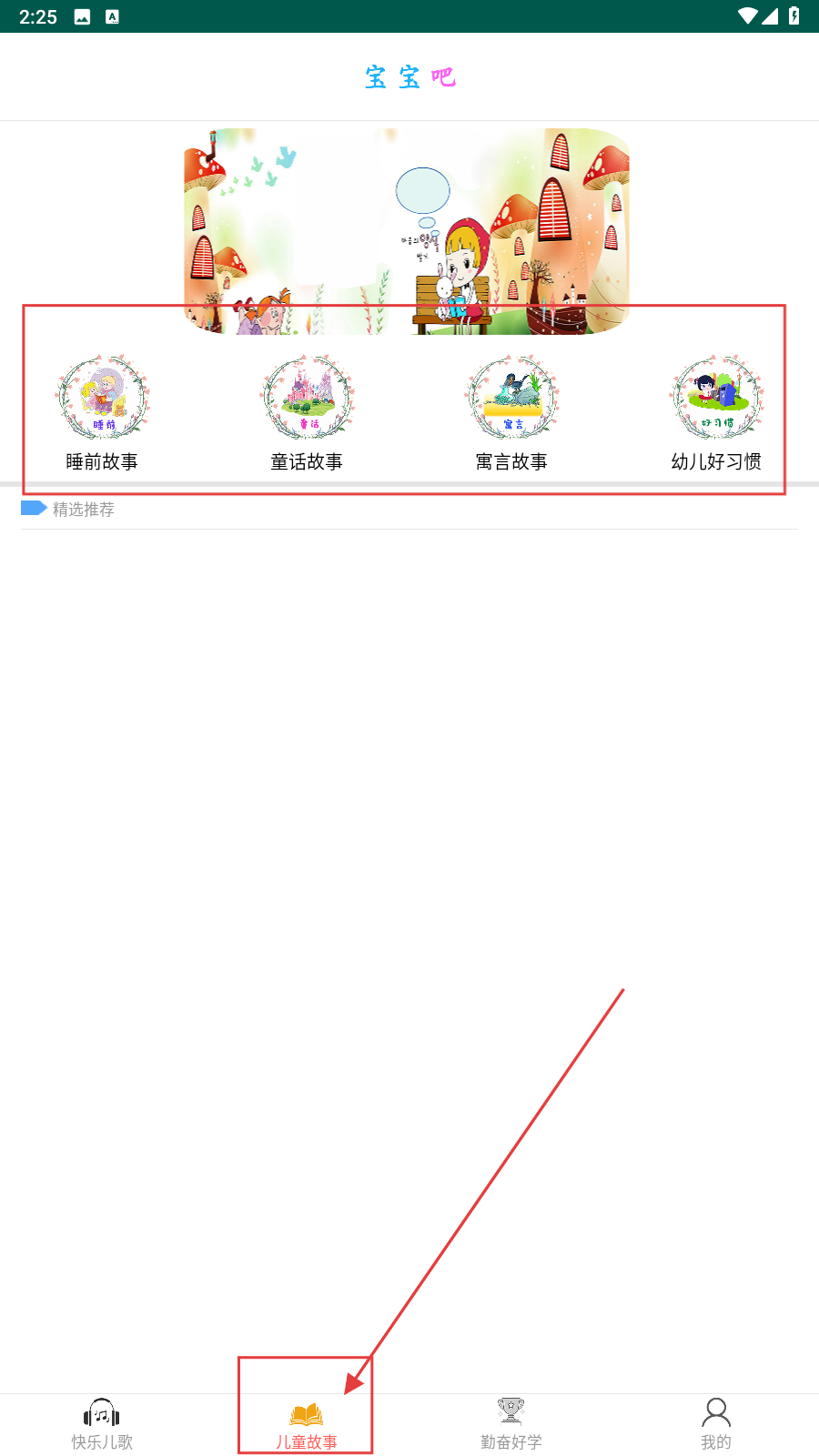 2、点击底部【儿童故事】按钮。在此界面,选择【睡前故事】【童话故事】等分类,播放故事音频,培养孩子的想象力和良好习惯。
