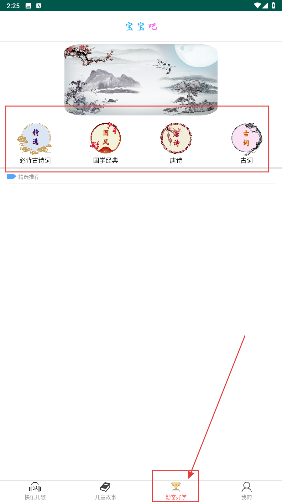 3、点击底部【勤奋好学】按钮。在该界面,选择【必背古诗词】【国学经典】分类,播放相关国学内容音频,帮助孩子学习传统文化知识。