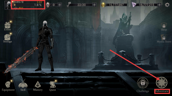 1、在游戏主界面,关注左上角角色信息,通过点击右下角【Adventure】进入冒险关卡,开启游戏进程。