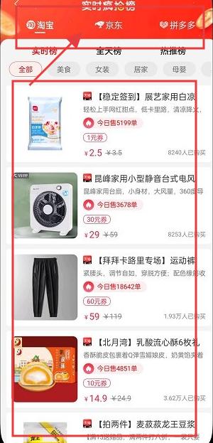 1、打开应用,进入【实时榜】页面。可按【全部】【美食】【女装】等分类筛选。