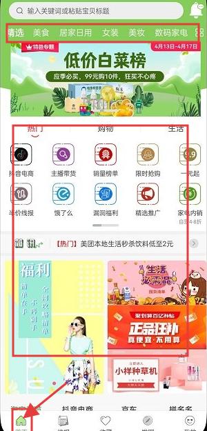 2、点击底部【首页】按钮。在【低价白菜榜】区域,可通过【精选】【美食】等分类查找商品。