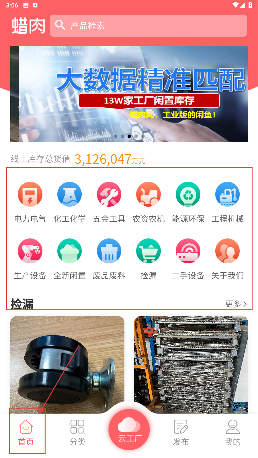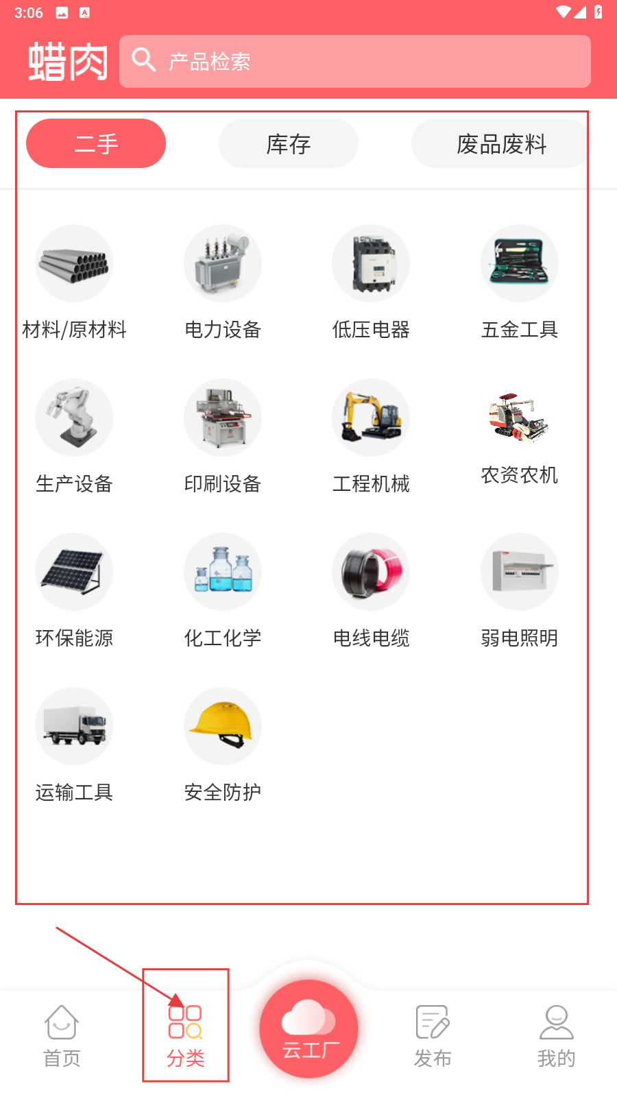 2、点击底部【分类】,按【二手】【库存】【废品废料】筛选,再选【材料/原材料】【电力设备】等子类,精准定位所需工业产品。
