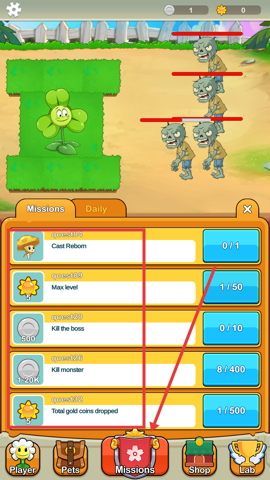 1、常查看【Missions】界面任务,像【quest04】【CastReborn】等,按要求完成来获奖励,推动游戏进程。